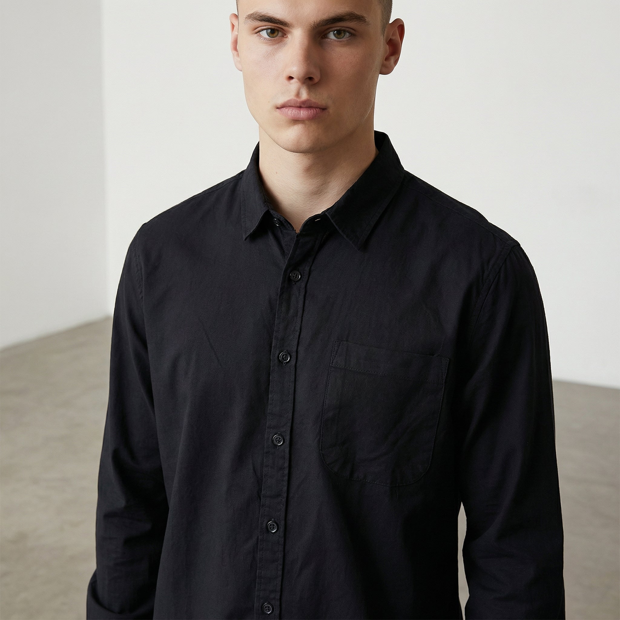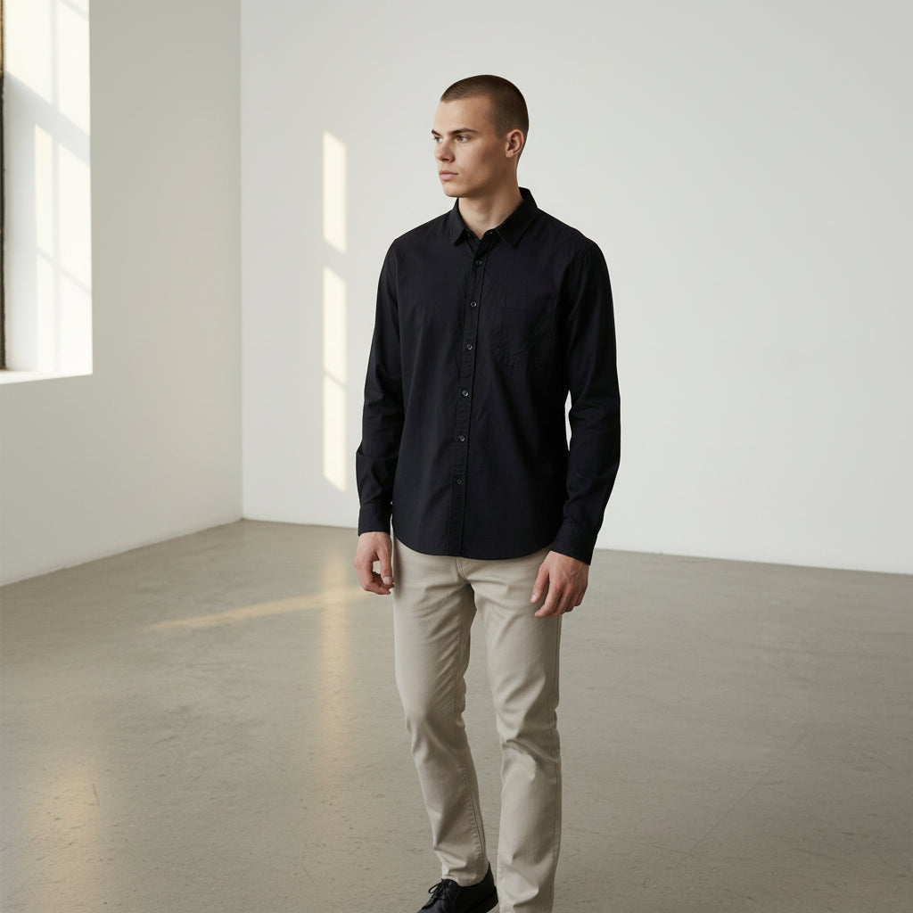 Camisa elaborada con fibra de algodón puro que garantiza transpirabilidad y confort prolongado. Confeccionada en México con un corte regular que se adapta a la silueta de forma natural. Disponible en la talla S que se muestra, perfecta para un estilo contemporáneo y versátil.